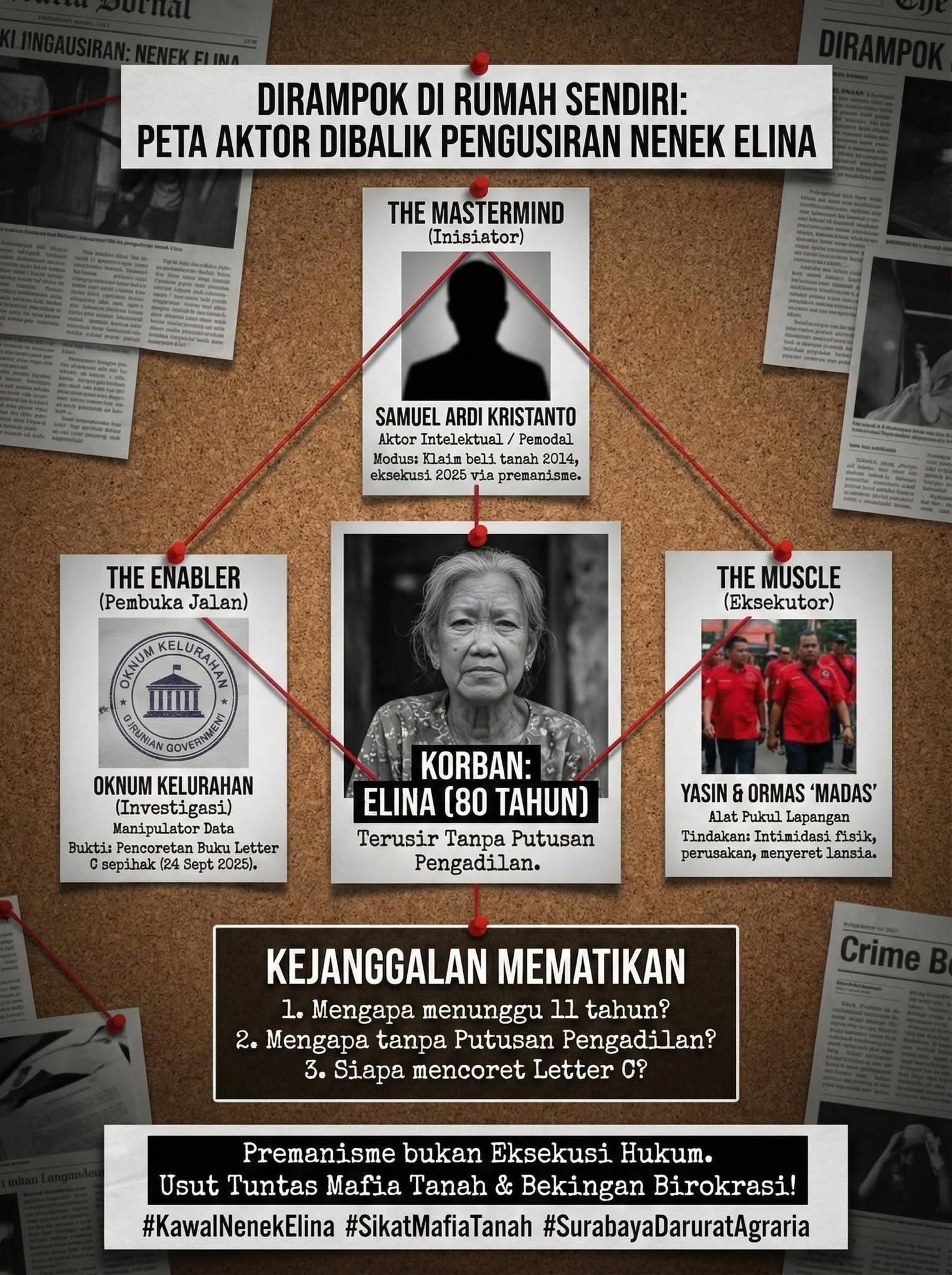 Surabaya, 29 Desember 2025 — Jeritan Nenek Elina (80) yang diseret paksa dari rumahnya sendiri bukan hanya tragedi kemanusiaan. Itu adalah bunyi lonceng peringatan bagi rapuhnya perlindungan hak tanah di Indonesia.