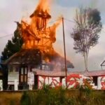 Asap tebal juga tampak membubung, dan struktur bangunannya pun perlahan runtuh menjadi abu dan rata dengan tanah.
