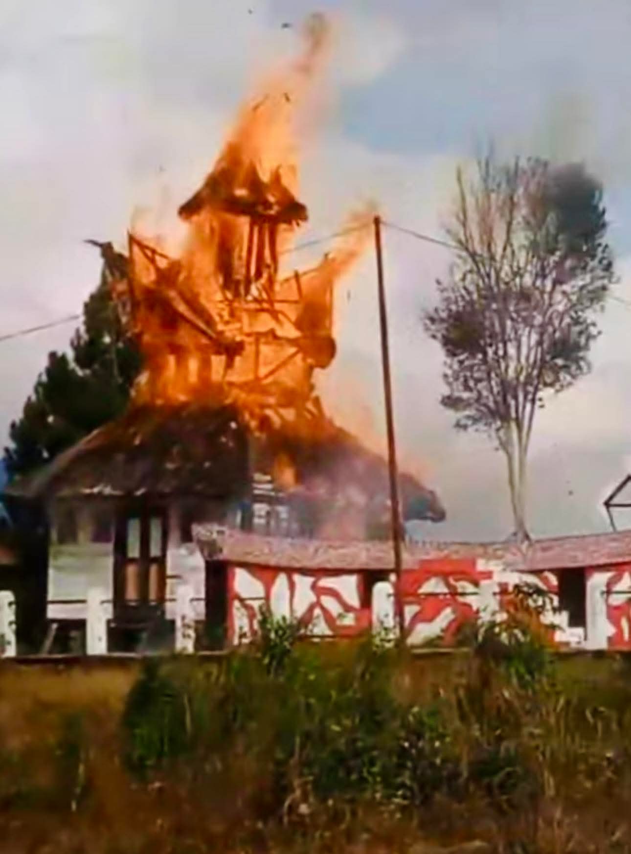 Asap tebal juga tampak membubung, dan struktur bangunannya pun perlahan runtuh menjadi abu dan rata dengan tanah.